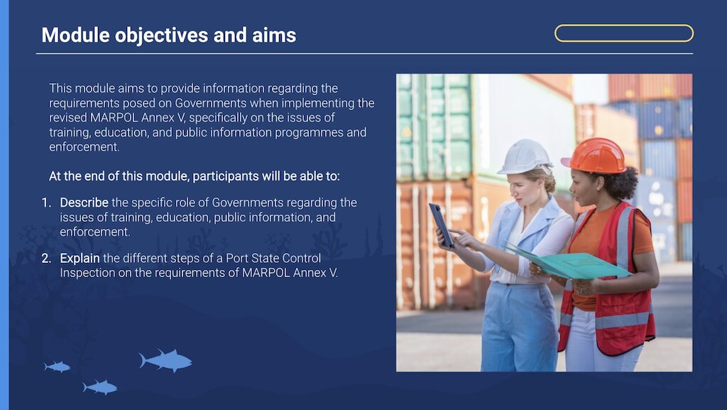 IMO has drafted a number of e-Learning courses with the purpose of increasing the capacity of Member States to effectively implement IMO instruments. The MARPOL Annex V e-learning course was set up to help strengthen the global response to marine plastic litter from sea-based sources and to support effective implementation of the International Convention for the Prevention of Pollution from Ships (MARPOL), Annex V.