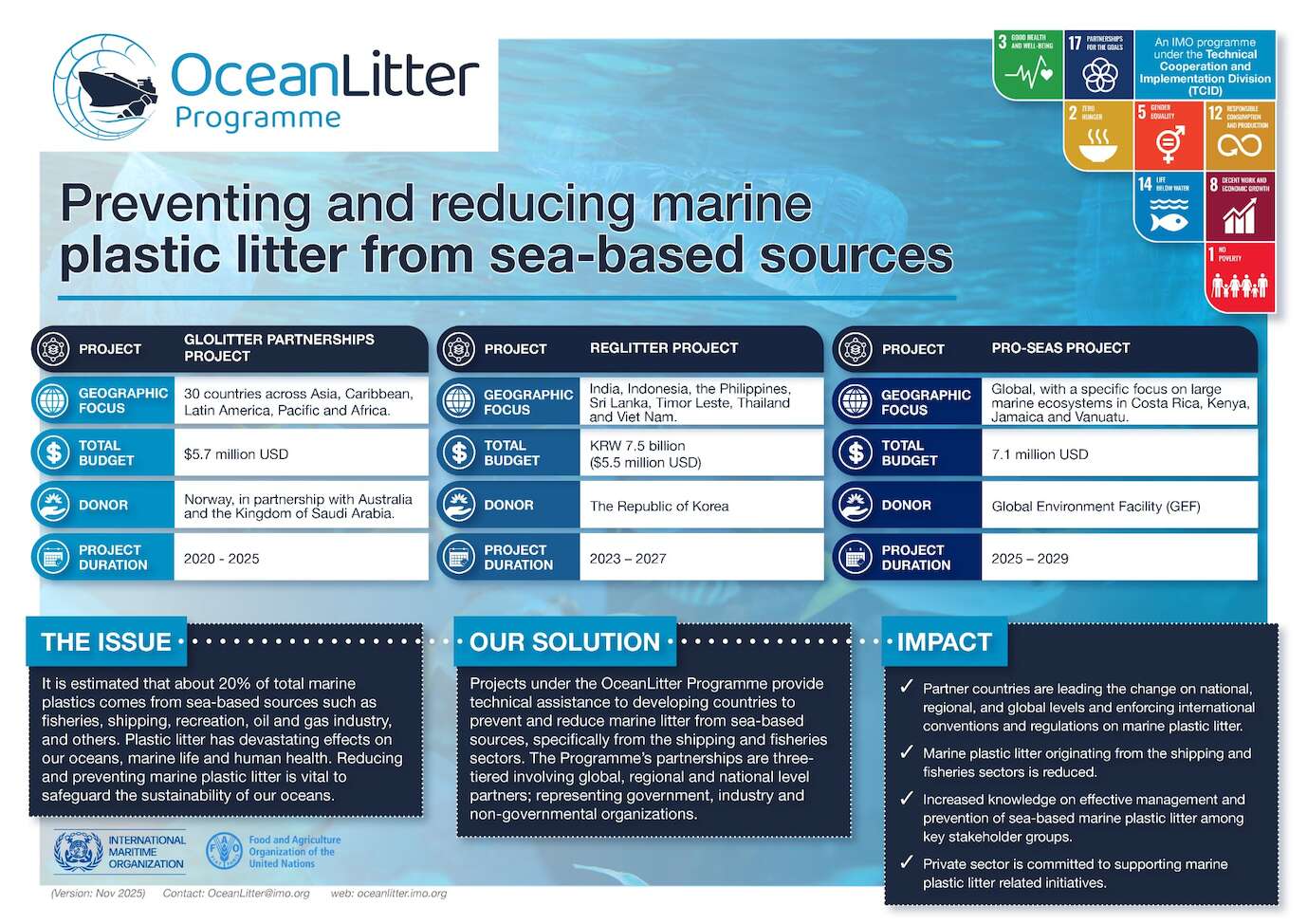 The GloLitter Partnerships Project is joined by the RegLitter Project and proposed PRO-SEAS project under the IMO OceanLitter Programme, to allow for efficient coordination and knowledge-sharing between the projects to benefit member states in the drive to combat marine plastic litter from the shipping and fisheries industries. The Programme ensures continued positive progress towards a healthier marine ecosystem through implementation of the international conventions and instruments of IMO such as Marpol Annex V, London Convention/Protocol and implementation of the IMO Action Plan to Address Marine Plastic Litter from Ships, as well as FAO Voluntary Guidelines on the Marking of Fishing Gear, and towards the relevant Sustainable Development Goals of the United Nations.